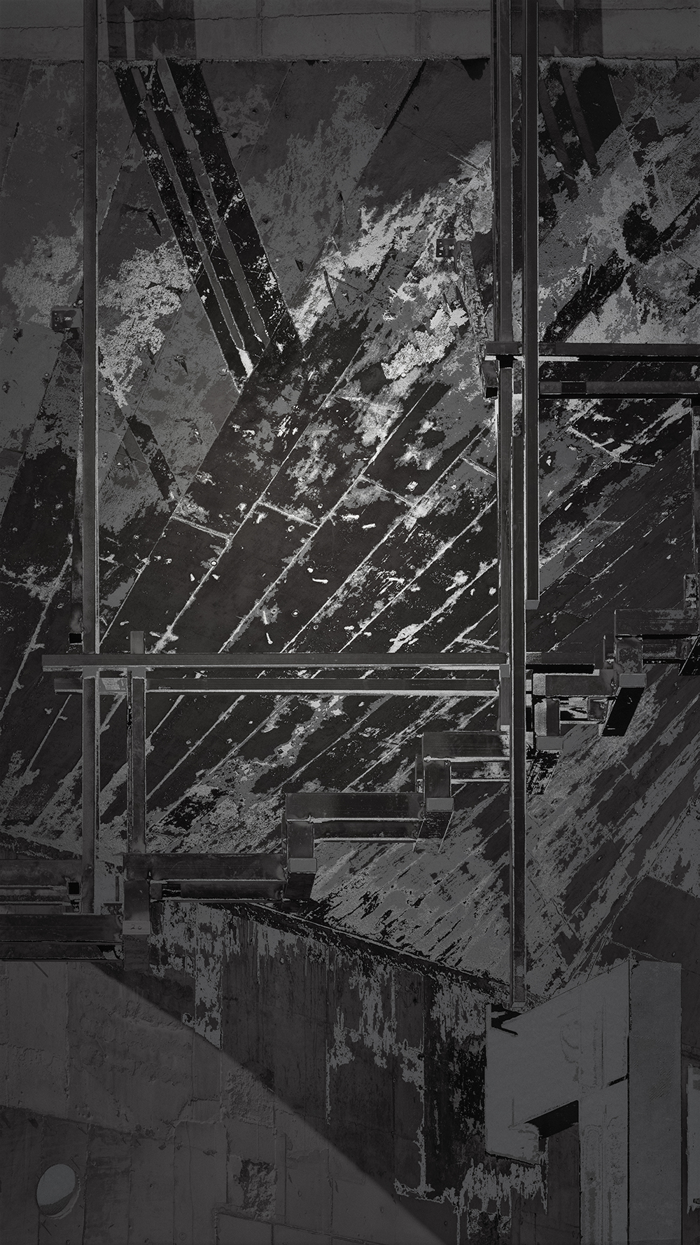 His multilayered silkscreens visualize the temporality of building processes, while his 3D simulation-constructed from over 10,000 photographs-renders spatial memory as immersive encounter. His work visualizes the invisible durations and structural shifts embedded in architectural formation.